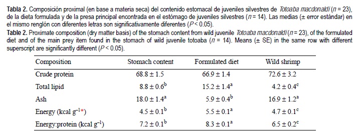 La composición proximal del contenido estomacal de las totoabas silvestres y los camarones silvestres, encontrados como principal presa en el contenido estomacal, fue considerablemente menor en cuanto a los contenidos de lípidos y energía en comparación con la dieta formulada (tabla 2).