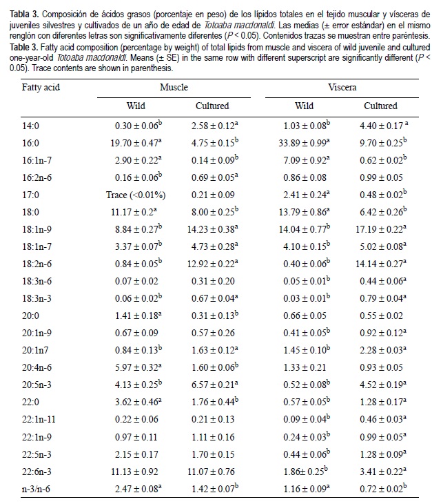 Las diferencias registradas en cuanto al contenido de lípidos y la composición de ácidos grasos en músculo y vísceras de las totoabas cultivadas y las silvestres (tablas 1, 3) pueden atribuirse a diferencias en la dieta. Los lípidos pueden ser usados como fuentes de carbono y energía, pero esto suele suceder sólo después de que se agotan otras fuentes de energía. Los lípidos se pueden depositar directamente al ingerirse o después de ser modificados (alargados y/o desaturados). Los contenidos de lípidos en músculo y vísceras fueron mayores en los peces cultivados que en los silvestres (tabla 1). Esta diferencia también ha sido mencionada por Rodríguez et al. (2004), quienes encontraron que la acumulación de lípidos en individuos de S. cantharus alimentados con dietas altas en lípidos fue 2.5 veces mayor en los organismos cultivados que en los silvestres. Esto concuerda con nuestros resultados para T. macdonaldi dado que la acumulación de lípidos resultó 2.2 veces mayor en los peces cultivados.