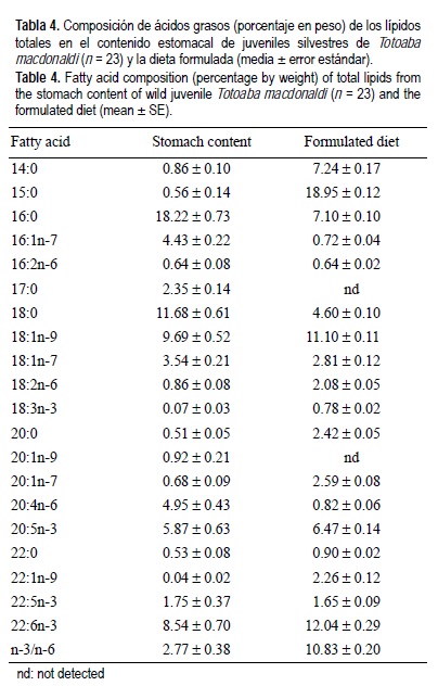 Finalmente, la composición de ácidos grasos mostró mayores concentraciones de ácidos 16:0, 16:1n-7, 17:0, 18:0, 20:1n-9 y 20:4n-6 en el contenido estomacal que en la dieta formulada. Al contrario, los valores de ácidos 14:0, 18:2n-6, 20:0, 20:1n-7, 22:1n-9, 22:6n-3 y la razón n-3/n-6 fueron mayores en la dieta formulada que en el contenido estomacal (tabla 4).
