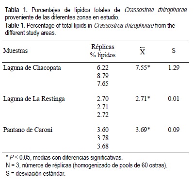 La mayor concentración de lípidos (tabla 1) se obtuvo en las ostras provenientes de la Laguna de Chacopata con un valor de 7.55 ± 1.3%, con diferencias altamente significativas (P < 0.05) en el contenido lipídico de las muestras de estudio. Esto se constató a través de la prueba a posteriori (LSD), que mostró la formación de tres grupos: Laguna de Chacopata (7.55 ± 1.3%), Pantano de Caroni (3.69 ± 0.09%) y La Restinga (2.71 ± 0.01%)].