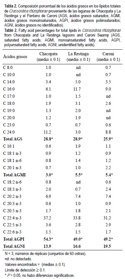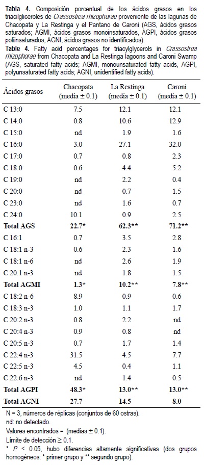 Los ácidos grasos saturados de los triacilgliceroles (tabla 4) mostraron valores mínimos, de 22.7%, en las ostras provenientes de Chacopata, seguidas por las de La Restinga con 62.3% y las del Pantano de Caroni con 71.2%, prevaleciendo el ácido palmítico (16:0). Los ácidos grasos poliinsaturados estuvieron entre 13.0% y 48.3%, con valores mínimos en las ostras de las lagunas de La Restinga y el Pantano de Caroni, y los máximos en las muestras de Chacopata. Estos ácidos estuvieron representados principalmente por el ácido adrénico (22:4), con valores de 31.5% en C. rhizophorae provenientes de Chacopata y valores menores en los especimenes del Pantano de Caroni (7.7%) y La Restinga (4.5%).