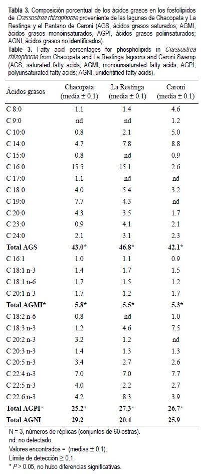 En los fosfolípidos (tabla 3) dominaron los ácidos grasos saturados, con valores mínimos (42.1%) en las ostras provenientes del Pantano de Caroni y máximos (46.8%) en las La Restinga. Prevalecieron el ácido palmítico (16:0), con valores entre 12.3% y 15.5%, seguido por el mirístico (14:0) y el esteárico (18:0), los cuales a pesar de presentar elevadas concentraciones en las ostras de Chacopata y La Restinga, no se detectaron en las procedentes del Pantano de Caroni. Al comparar estos resultados con los encontrados por Martino et al. (2002) y Cavalcanti y Da Cruz (2004), se observa que las concentraciones de grasas saturadas encontradas en esta investigación son doblemente superiores a las señaladas por estos autores en sus estudios. Este incremento se atribuye a las elevadas temperaturas observadas en las zonas analizadas, las cuales propician un mayor flujo a través de la membrana celular de los organismos de esta especie y, por ende, el aumento de estos ácidos grasos en los fosfolípidos.