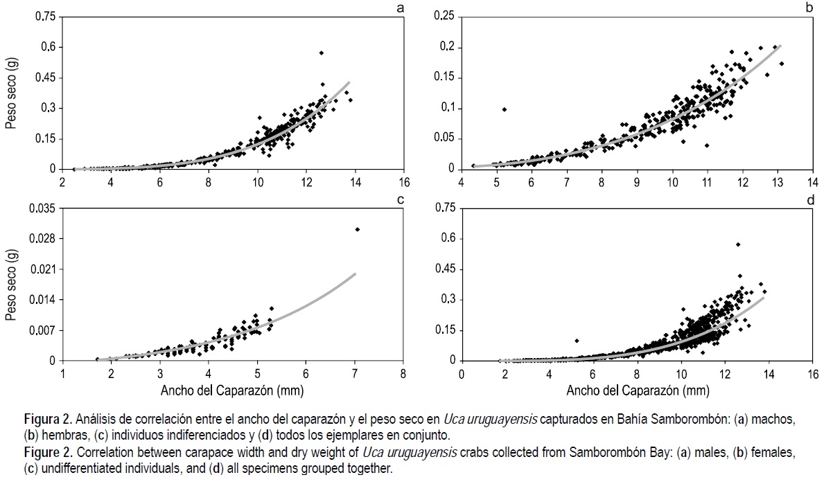 Se recolectaron individuos de Uca uruguayensis (n = 1200, 216 megalopas, 984 indiferenciados y adultos), se contaron y clasificaron en indiferenciados, machos o hembras. Cada uno se midió (ancho del caparazón, AC) y pesó (peso seco, PS). Los cangrejos fueron analizados y separados en cohortes mediante la conversión de la distribución polimodal de frecuencias de tallas en curvas normales. Se registraron seis cohortes durante el periodo de estudio, coexistiendo dos cohortes en septiembre y diciembre de 2001, abril y octubre de 2002, y tres en marzo y junio de 2001, diciembre de 2002 y febrero de 2003. Se capturaron hembras ovígeras en diciembre de 2001 y 2002, y febrero de 2003, esta última fecha en que se registró el establecimiento de las megalopas en todas las estaciones de muestreo. Se obtuvo la correlación entre AC y PS, y se analizó el patrón de crecimiento aplicando la función potencial (PS = a ACb). Machos, hembras e individuos indiferenciados fueron analizados, independientemente o en conjunto, evidenciándose una alometría positiva para el PS y presentando los machos los valores mayores de alometría. Para estimar la producción anual se utilizó el método de frecuencias de tallas, donde la mayor contribución a la producción estuvo dada por los individuos maduros, en particular por los incluidos en el intervalo de tallas de 10 a 11.99 mm. Por otra parte, se registró un número bajo de individuos en las tallas previas a la pubertad. La biomasa total (expresada en PS) varió entre 20 y 611 mg m-2 y los valores más altos se registraron durante el verano.