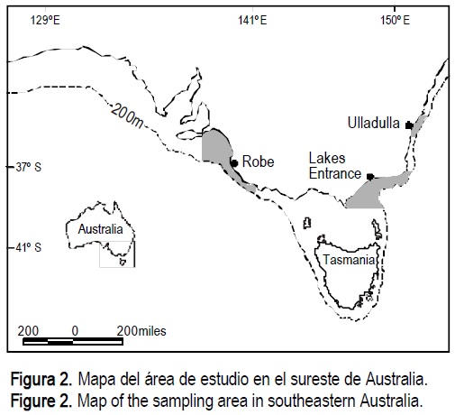 Se recolectaron especímenes de S. megalops de manera oportunista entre la captura incidental de las embarcaciones de pesca con red de enmalle para tiburón y red de arrastre demersal que operan en la pesquería de tiburón y peces de escama en el sur y este de Australia. Las muestras se recolectaron entre octubre de 2002 y abril de 2004, principalmente de las localidades de Robe, Lakes Entrance y Ulladulla (fig. 2). Se empleó de 4 a 8 horas una red de enmalle para tiburón, de monofilamento, luz de malla de 16.5 cm, ~4000 m de longitud y 2.4 m de profundidad, durante la noche y el día. Los aparejos de arrastre de fondo utilizados fueron la red de arrastre de puertas y la red danesa, el primero con una relinga superior de 24-50 m y luz de malla estirada en el copo de 90 mm y el segundo con una relinga superior de 30-59 m y luz de malla estirada en el copo de 38 mm. Los arrastres se realizaron por 3-4 horas durante la noche y el día. La profundidad de pesca fue de entre 21 y 238m y varió según la localidad y el arte de pesca. Las longitudes totales (LT) de S. megalops fueron medidas al milímetro más cercano y la condición reproductiva de los machos y las hembras se determinó siguiendo las recomendaciones de Braccini et al. (2006).
