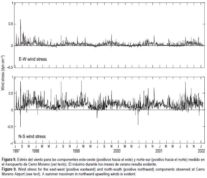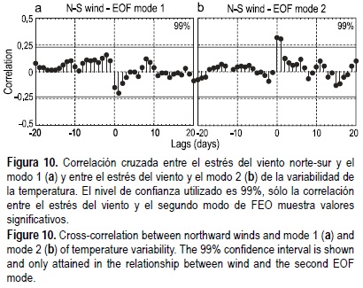 Los vientos son favorables a la surgencia durante todo el año, pero son más intensos durante los meses de verano (fig. 9). Éstos muestran una fuerte variabilidad sinóptica. Mientras el primer modo de FEO de la variabilidad en la temperatura está dominado por fluctuaciones de baja frecuencia, ésta no muestra relación con el estrés del viento. Sin embargo, el segundo modo de FEO muestra una fuerte variabilidad sinóptica que está significativamente relacionada con el estrés del viento a lo largo de la costa (99% de confianza). El signo de la correlación (y de los vectores propios del segundo modo de FEO) indican que un aumento en los vientos del sur (vientos de surgencia) produce una caída en la temperatura a lo largo de la costa expuesta y un aumento en la temperatura del mar dentro de la bahía, y que la caída en la temperatura responde al viento con un rezago de 0 y 1 días (fig. 10).