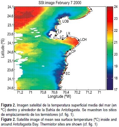 La temperatura superficial del mar en la costa exhibe un patrón que es coherente con aguas más cálidas dentro de la bahía (entre Las Conchillas y Punta Coloso) y un máximo superior a 18°C en La Rinconada, por el sector norte de la bahía (figs. 1a, 2). Las áreas adyacentes hacia el norte (Lagarto y Punta Loberías) y sur (El Cobre y Punta Jorgillo) de la Bahía de Antofagasta son mas frías, con promedios de temperatura entre 15°C y 16°C (figs. 1a, 2). Se observó una diferencia de pequeña escala en la temperatura media entre Punta Coloso y Punta Jorgillo, en la entrada sur de la bahía. La presencia de frentes de temperatura en dicha área ha sido descrita previamente utilizando imágenes de satélite (Castilla et al. 2002, Lagos et al. 2002). En este contexto, el patrón espacial de la temperatura superficial se observa a partir de la distribución de la TSM obtenida del promedio de seis imágenes de TSM (sin condiciones de nubes) entre 1998 y 2000 (fig. 2). Se observó que existe coherencia entre la TSM (obtenida con satélite) y la temperatura del mar en la costa (obtenida con los termistores), en la que la bahía aparece con temperaturas más cálidas (>21°C) que las temperaturas observadas en los sitios hacia el norte y sur de la bahía.