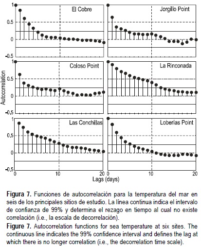 Resulta importante la variabilidad sinóptica (banda meteorológica) de la temperatura del mar en la costa, con fluctuaciones de hasta 5°C se pueden observar en la mayoría de los sitios (figs. 3, 5). Si definimos la variabilidad sinóptica como las fluctuaciones entre dos y siete días, es posible calcular la influencia relacionada con esta variabilidad sinóptica para seis de los sitios más importantes. A lo largo de la costa expuesta la variabilidad sinóptica explica aproximadamente el 10% de la variabilidad total (fig. 6), mientras que dentro de la bahía esta escala de variabilidad es relativamente más débil (en parte gracias a la fuerte señal estacional dentro de la bahía). Sin embargo, la fuerte variabilidad sinóptica es observada en la zona de frentes alrededor de Punta Coloso y Punta Jorgillo (aproximadamente 20% del total). La idea de menor variabilidad sinóptica dentro de la bahía está apoyada por las largas escalas de tiempo que muestra la escala de decorrelación en la bahíae.g. 12 días en La Rinconada y 10 días en Las Conchillas (fig. 7). En contraste, los sitios expuestos a surgencia tales como El Cobre, Punta Loberías y Punta Jorgillo exhibieron escalas de tiempo menores (<5 días), así como también Punta Coloso, en la entrada sur de la bahía, de tal forma que mientras los vientos de surgencia controlan la variabilidad en la temperatura en los sitios de la costa expuesta, al parecer las aguas superficiales dentro de la bahía son retenidas por periodos de una o dos semanas.