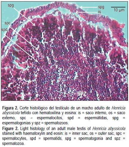 La oogénesis en H. abyssicola fue asincrónica, con producción de oocitos vitelogénicos a lo largo del año y los individuos mostraron un intervalo amplio de desarrollo de los oocitos independientemente del periodo de muestreo (fig. 5). Existe un amplio intervalo de tallas de oocitos con una alta proporción (10-56%) de oocitos previtelogénicos (<200 μm) con un pico (56%) en julio. El porcentaje de oocitos vitelogénicos grandes, principalmente en el intervalo de clase de 500 um, mostró un pico en mayo (20%) seguido por los valores mas bajos en julio, probablemente indicando un periodo de desove entre junio y julio, lo cual coincidió con los valores más bajos del IG. Después de julio la proporción de oocitos vitelogénicos grandes mostró un incremento constante en agosto (6%), octubre (8%) y noviembre (14%). En los machos los testículos tuvieron un suministro constante de espermatozoides a lo largo del año.