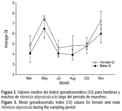La media (± desviación estándar) del IG de H. abyssicola fue 5.6 ± 1.5 (n = 53) para hembras y 4.9 ± 1.9 (n = 52) para machos. Se observaron picos anuales en el IG en mayo y noviembre. El pico de mayo fue seguido por una marcada caída en los valores del IG, probablemente indicando un periodo importante de desove entre junio y julio. Los valores comienzan a incrementarse en agosto. No hubo muestreos de diciembre a febrero, por lo tanto no fue posible describir la conducta del IG después del pico de noviembre (fig. 3). El ANOVA mostró que las variaciones mensuales en el IG no fueron significativamente diferentes en hembras ni en machos (F = 6.608, g.l. = 5, P > 0.05 para hembras, y F = 4.965, g.l. = 5, P > 0.05 para machos), y el traslapo considerable de los limites de confianza al 95% sugiere que no existe sincronía en el desarrollo de los ovarios entre muestras.