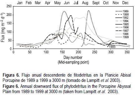 La deposición de fitodetritus en el fondo marino puede también proporcionar una fuente intermitente de alimento lábil para las estrellas adultas (Billet et al. 1983, Rice et al. 1986). Se propone, de acuerdo a las características reproductivas de Henricia abyssicola, que en esta especie los adultos hacen uso de la fuente energética representada por el fitodetritus y los efectos se ven reflejados en los oocitos en desarrollo. Se observaron dos picos en los valores del IG en los meses de mayo y noviembre. Al pico de mayo siguió una disminución considerable en el IG, probablemente indicando un incremento importante en la liberación de gametos entre junio y julio. Algunos registros históricos del flujo descendente de fito-detritus en la Planicie Abisal Porcupine indican que es entre mayo y agosto cuando el fitodetritus alcanza el fondo marino a una profundidad aproximada de 3000 m (Lampitt et al. 2003) (fig. 6). Los valores de la fecundidad muestran la misma tendencia que el IG y el patrón de la proporción de tallas de oocitos a lo largo del año se asemeja de manera general al observado en especies de aguas someras que se reproducen estacionalmente. El porcentaje de oocitos vitelogénicos grandes, principalmente en el intervalo de clase de 500 um, presenta un pico en mayo (20%), seguido por el valor más bajo en julio (2%) cuando en las gónadas había principalmente oocitos previtelogénicos.