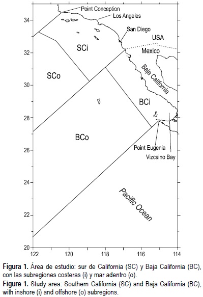 El área de estudio incluye el SCC del sur de California y Baja California, desde la costa hasta 122°00' W. El límite norte se encuentra entre Punta Concepción (EUA) y 34°30' N, y el límite sur entre Punta Eugenia (México) y 20°45' N (fig. 1).