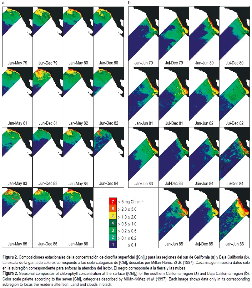 La tendencia general de las imágenes del CZCS mostró valores de [Chl]s mayores en las subregiones costeras que en las subregiones mar adentro (fig. 2). El intervalo de los promedios de [Chl]s para las subregiones costeras (SCi y BCi) fue de 0.42 a 3.06 mg m-3 y para las de mar adentro (SCo y BCo) fue de 0.08 a 0.42 mg m-3. El promedio mínimo de [Chl]s para todas las subregiones se presentó durante la temporada cálida de 1983, mientras que los máximos se presentaron en 1981 y 1986 para las subregiones de SC y BC, respectivamente. La disminución de [Chl]s durante 1983 es consecuencia de la influencia de uno de los eventos ENSO más fuertes del siglo (Trenberth y Stepaniak 2001), el cual se pudo observer inclusive durante la temporada cálida de 1984.