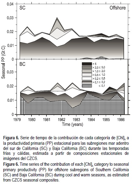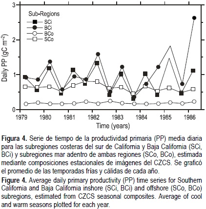 Aparentemente las variaciones interanuales para las sub-regiones costeras están relacionadas con los factores físicos y climatológicos que afectan las surgencias, mientras que las variaciones interanuales mar adentro son mínimas, asociadas con la circulación oceánica principal y las condiciones climatológicas y de circulación favorables para estructuras de [Chl] que se alejan del continente, presentando un patrón estacional. Es importante tomar en cuenta, sin embargo, el hecho de que el algoritmo utilizado para estimar [Chl]s es susceptible a sesgos. Kahru y Mitchell (2000) encontraron que las imágenes del CZCS tienden a sobreestimar para concentraciones altas y a subestimar para concentraciones bajas, en comparación con los datos de SeaWifs. Al comparar la PP estimada mediante imágenes del CZCS con los datos de CalCOFI tomados in situ y ordenados temporal y espacialmente de la misma forma que las imágenes, se encontró una subestimación en todos los casos, excepto para la subregión mar adentro de SC, donde las estimaciones de PP fueron mayores que las mediciones integradas de CalCOFI.