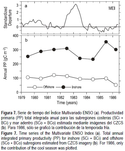 A fin de detectar las diferencias en el patrón de distribución de las subregiones costeras vs. mar adentro, se estimaron los valores anuales de PP para ambas subregiones (fig. 7). Como ya se indicó, los valores fueron mayores en las subregiones costeras que mar adentro. La subregión mar adentro presentó menor variabilidad y una PP más alta en 1981 (antes del ENSO) y más baja en 1984 (al final del ENSO) (fig. 7b). El Índice Multivariado ENSO (Wolter y Timlin 1998) evalúa la magnitud relativa de los eventos de El Niño y La Niña con base en seis variables del Pacífico tropical. Este índice se graficó junto con los resultados de la PP (fig. 7a) para el periodo de estudio y mostró evidencia del evento de 1983. El efecto del ENSO es evidente en ambas subregiones y aparece como un decremento en los valores de PP especialmente durante 1983 y 1984.