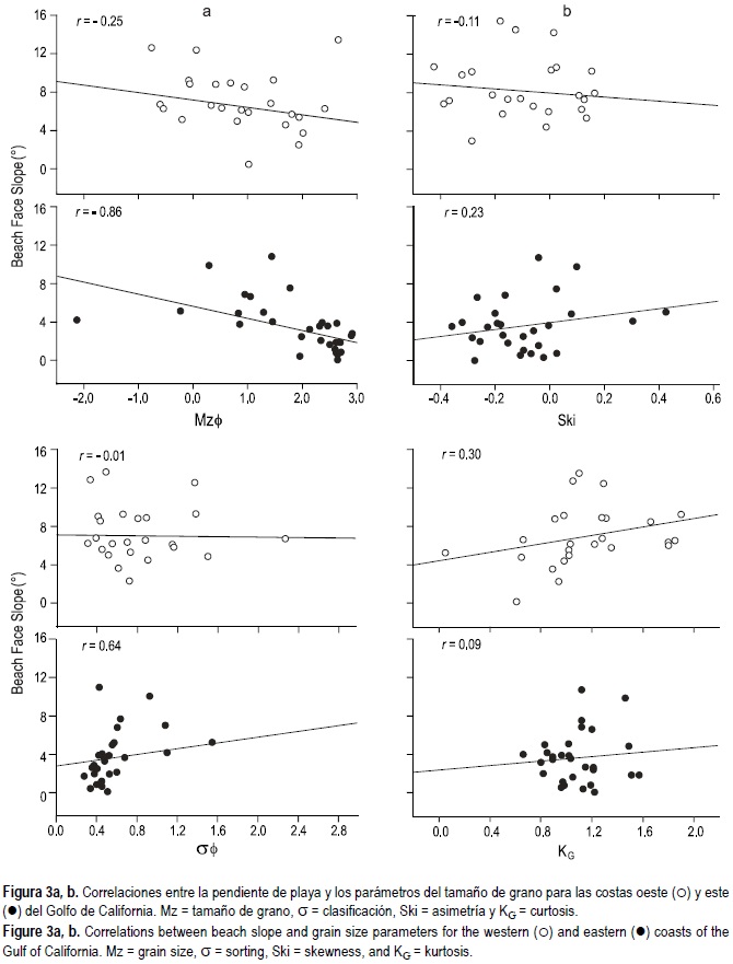 En la arena de la costa oeste se observaron correlaciones pobres entre la pendiente de la cara de la playa y el tamaño de grano, la clasificación, la asimetría y la curtosis (fig. 3a, b). A pesar de presentar un valor de correlación bajo, la única relación significativa parece existir entre la pendiente de playa y la clasificación.