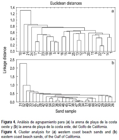 El análisis de agrupamiento de la arena de la costa este mostró que las muestras 31 y 33 a 42 se agruparon en el lado izquierdo del dendrograma, con cierto traslapo con otros sitios (fig. 4b). Éstas, sin embargo, corresponden a la planicie costera relativamente más amplia de la costa este en comparación con los demás sitios de la misma área (fig. 1). Las muestras en el lado izquierdo del dendrograma no muestran un grupo bien definido (fig. 4b). Las muestras 48, 50 y 51 corresponden a la zona norte de Bahía Banderas.