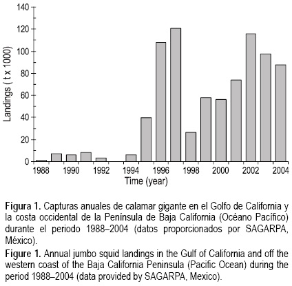 Las capturas de calamar gigante de los últimos años reflejan la gran abundancia de esta especie y su importancia como recurso dentro del sistema productivo pesquero de México. Sin embargo, no se puede obviar la fuerte variabilidad interanual que se observa en la serie histórica de sus capturas (fig. 1). Hasta la fecha se desconocen las causas de esta variabilidad aunque algunos autores sugieren que puede estar relacionada con cambios en las condiciones ambientales u oceanográficas, como la ocurrencia de eventos El Niño (Lluch-Cota et al. 1999, Morales-Bojórquez et al. 2001, Nevárez-Martínez et al. 2002, Markaida 2006), mientras que otros sugieren que puede haber una relación con los patrones migratorios de alimentación, de reproducción o con el éxito en el reclutamiento (Klett-Traulsen 1981; Ehrhardt et al. 1982, 1986; Ramírez y Klett-Traulsen 1985).