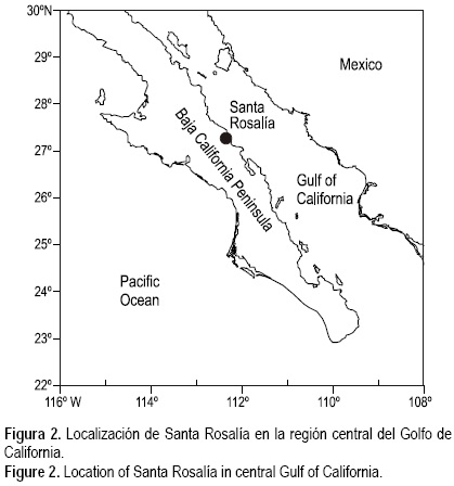 Durante las temporadas de pesca 2003 y 2004 se recolectaron muestras de calamar gigante en el área de Santa Rosalía, Baja California Sur, México (fig. 2). Cabe mencionar que el muestreo de noviembre de 2003 fue el único en el cual no se capturaron clamares (tabla 1). El método de captura fue el mismo que se utiliza en la pesquería artesanal de D. gigas con botes ("pangas") de 6-8 m y dos pescadores que operan manualmente líneas de pesca con poteras de 40 cm.