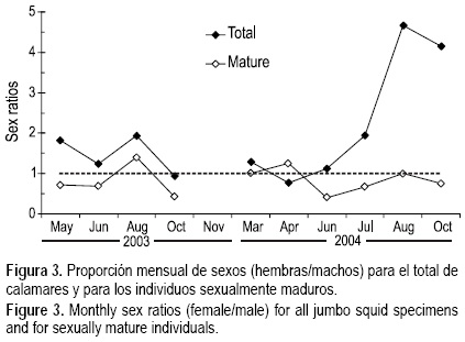 Los valores de la proporción de sexos obtenidos durante las temporadas de pesca 2003 y 2004 mostraron una clara dominancia de las hembras sobre los machos de D. gigas, tanto en el total de los ejemplares examinados así como en los ejemplares inmaduros y madurando (sólo en 2003). Sin embargo, el análisis con los ejemplares sexualmente maduros mostró lo opuesto, una dominancia de los machos sobre las hembras que podría estar indicando que la región de Santa Rosalía es principalmente un área de alimentación y no un área de reproducción. Esto fue sugerido previamente por Markaida y Sosa-Nishizaki (2001), quienes observaron resultados similares durante las temporadas de pesca 1995-1997, frente a Guaymas y Santa Rosalía (región central del Golfo de California).