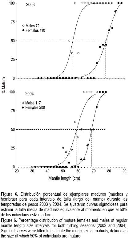Los machos sexualmente maduros fueron dominantes en todos los muestreos de 2003, lo cual sugiere que están preparados para la reproducción durante gran parte del año. Sin embargo, en 2004 se observó una clara predominancia de machos inmaduros a excepción de los últimos dos muestreos mensuales (agosto y octubre). De esta forma, se evidencia una clara diferencia en la madurez sexual de los ejemplares de ambos sexos entre 2003 y 2004. La población de calamar gigante observada en la temporada 2003 reflejó altas proporciones de individuos maduros mientras que la observada en 2004 estuvo compuesta mayoritariamente por individuos sexualmente inmaduros. Estas diferencias también se vieron reflejadas en la estructura de tallas de machos y hembras, las cuales fueron significativamente mayores durante 2003.