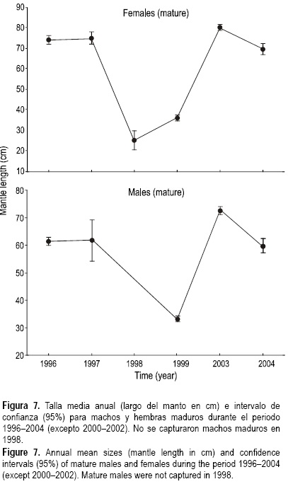Existen antecedentes que indican que la estructura poblacional del calamar gigante dentro del Golfo de California puede variar considerablemente entre algunos años (Ramírez y Klett-Traulsen 1985, Markaida 2006). No obstante, aún no ha sido posible establecer patrones claros que reflejen dicha variabilidad interanual. Entre 1994 y 1997 la pesquería de calamar gigante dentro del Golfo de California estuvo operando sobre ejemplares de gran tamaño (hembras madurando a los 75 cm y machos a los 53-67 cm LM), con capturas que alcanzaron 108,000 y 121,000 toneladas en 1996 y 1997, respectivamente (Markaida y Sosa-Nishizaki 2001). Después de El Niño 1997-1998 la pesquería se desvaneció dentro del Golfo de California (Morales-Bojórquez et al. 2001). Dicho evento no sólo impactó la abundancia de calamar gigante sino también su estructura poblacional. En 1999 se observaron grandes cantidades de calamares madurando con tallas medianas (<45 cm LM) en varias regiones del golfo y las capturas alcanzaron las 58,000 toneladas (Markaida 2006). Luego de este periodo de transición se volvieron a observar calamares de gran tamaño en la pesquería durante el período 2000-2002 (Filauri 2005, Díaz-Uribe et al. 2006).