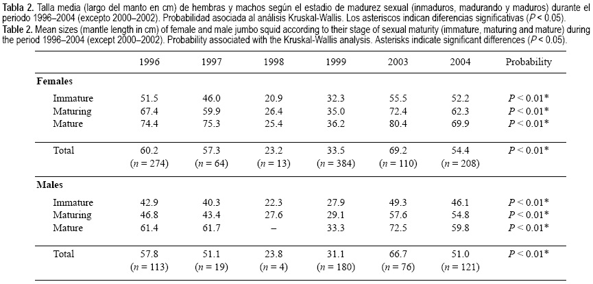 Los resultados obtenidos en este trabajo reflejan una fuerte variabilidad interanual en la estructura de tallas del calamar gigante (machos y hembras) en la región de Santa Rosalía durante el periodo 1996-2004 (excepto de 2000-2002). Esta variabilidad muestra concordancia con la reportada por Nevárez-Martínez et al. (2006) sobre la costa este del Golfo de California en la región de Guaymas durante el periodo 19952002. De hecho, resulta lógico pensar en un paralelismo de este tipo teniendo en cuenta la migración recíproca y estacional que realiza el calamar gigante entre ambas costas o zonas de pesca (Markaida et al. 2005).