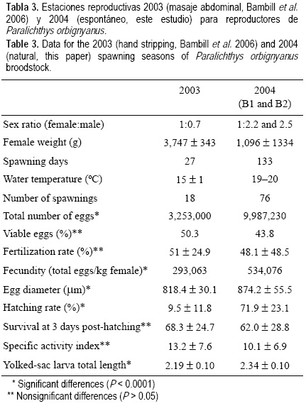 Comparando la producción de huevos y larvas obtenida por desoves naturales (2004) y por masaje abdominal (2003), se concluiría que los parámetros DH, TE y LT de larvas serían criterios apropiados para determinar la calidad de huevos y larvas en P. orbignyanus. Estos indicadores de calidad junto con S-3dpe e IAE son mencionados como determinantes de la calidad de los huevos de peces marinos por Kjersvik et al. (1990, 2003), Bromage (1996), Furuita et al. (2000) y Thorsen et al. (2003).