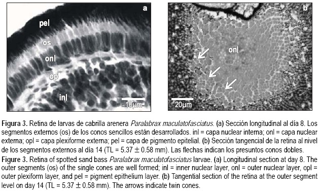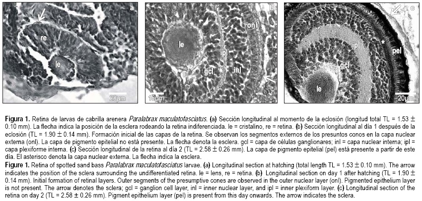 Al momento de la primera alimentación, los únicos fotorreceptores en la retina de las larvas de la cabrilla arenera son presuntos conos sencillos (Peña et al. 2004). Esta misma característica ha sido evidenciada en la retina de larvas de otras especies de teleósteos (Blaxter 1975, Kawamura et al. 1984, Pankhurst y Eagar 1996). Otros autores han mostrado que la retina consistente en conos sencillos como únicos fotorreceptores, presenta limitada agudeza visual y baja sensibilidad, lo cual reduce el contraste de un objeto (i.e., presas) (Evans y Browman 2004), y por consiguiente la eficiencia alimenticia de las larvas de peces (Peña et al. 2004, 2005). Igualmente, la retina de las larvas no tiene la capacidad de reaccionar ante cambios en la intensidad de luz ambiental (Ali 1975). Huse (1994) sugirió que esta característica puede limitar la distribución y el hábitat o zona de alimentación de las larvas en la columna de agua.