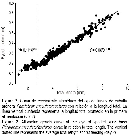 Adicionalmente, se tomaron muestras aleatorias de 30 ± 5 larvas una hora después de la alimentación cada día desde el día 2 hasta el día 12 y después cada dos días hasta el día 18, y finalmente el día 21. Después de ser anestesiadas, las larvas fueron fotografiadas digitalmente y se les midió la TL y el diámetro del ojo (ED) utilizando el analizador digital de imágenes Image-Pro Plus v4.5 (Media Cybernetics, MD, EUA). Se calculó el crecimiento alométrico del ojo durante la fase de alimentación endógena (desde la eclosión hasta la completa absorción del saco de vitelo) y desde la primera alimentación (día 2) hasta el día 21. Se utilizaron los datos no transformados en la la función potencial Y = aXb, donde Y es la variable dependiente (ED) y X la variable independiente (TL), a es la ordenada al origen y b es el coeficiente de crecimiento (Fuiman 1983). Si b = 1, el crecimiento es isométrico, si b > 1 el crecimiento es alométrico positivo, y si b < 1 el crecimiento es alométrico negativo (Fuiman 1983).