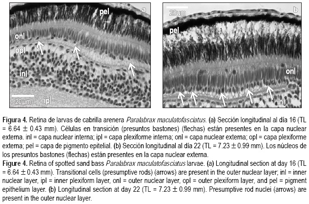 El día 14 (TL = 5.37 ± 0.58 mm) se observaron por primera vez presuntos conos dobles (fig. 3b), y al día 16 (TL = 6.64 ± 0.43 mm) se observaron varias células en transición, presumiblemente precursoras de bastones, que se incorporaban desde la capa nuclear interna hacia la región basal de la capa nuclear externa (fig. 4a). A partir del día 22 (TL = 7.23 ± 0.99 mm) se observaron los núcleos de los presuntos bastones en la capa nuclear externa (fig. 4b). A partir de este día, el sistema visual de la cabrilla arenera estuvo formado por una retina dúplex compuesta de conos y bastones como fotorreceptores.