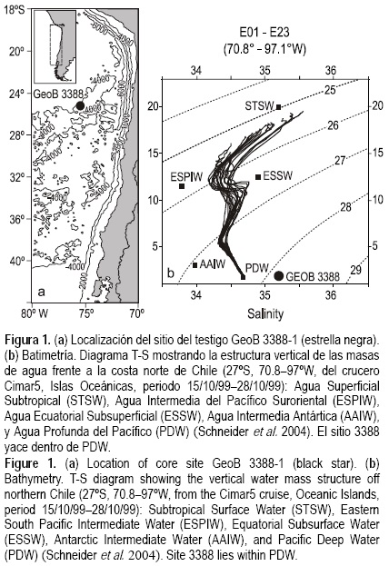 El testigo de sedimento GeoB 3388-1 fue obtenido bajo las aguas superficiales de la Corriente Perú-Chile. Esta corriente, la Corriente de Frontera Oriental más larga, se deriva de la bifurcación de la Corriente Circumpolar Antártica entre 40°S y 45°S, y se mueve hacia el norte a lo largo de la costa de Sudamérica hasta unirse a ~5°S con la Corriente Ecuatorial del Sur que fluye hacia el oeste (fig. 1a). El Océano Pacífico sudoriental tiene una rica estructura de masas de agua, con aguas que se originan en el Pacífico ecuatorial y subtropical al norte y en el Océano Sur al sur. El Agua Superficial Subtropical de alta salinidad se forma al sur de ~5°S y al norte del Frente Subtropical, donde la evaporación excede la precipitación (Stramma et al. 1995). Una capa somera de salinidad mínima aparece por debajo del Agua Superficial Subtropical (e.g., Reid 1973) y por arriba del Agua Ecuatorial Subsuperficial, de alta salinidad y bajo contenido de oxígeno, de la Corriente Submarina Gunther que fluye hacia el sur entre 100 y 400 m de profundidad sobre la plataforma y el talud continental frente a la costa central y norte de Chile (Toggweiler et al. 1991). Otra masa de agua más profunda es el Agua Intermedia Antártica, caracterizada por baja salinidad y alto contenido de oxígeno, la cual fluye hacia el ecuador entre profundidades de 400 y 1200 m. Por debajo de ésta prevalece el Agua Profunda del Pacífico, que fluye lentamente hacia el sur (fig. 1b). Una buena parte de la exportación de fosfatos y nitratos en el Pacífico ocurre en esta última masa de agua (Wunsch et al. 1983).