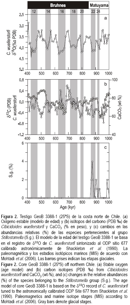 El modelo de edad del testigo GeoB 3388-1 se basó en el registro de isótopos de oxígeno estable del foraminífero bentónico C. wuellerstorfi, el cual es sustentado por análisis paleo-magnéticos (Mohtadi et al. 2006). El testigo GeoB 3388-1 se remonta a -1.03 ma AP (fig. 2a). Por tanto, se pueden observar valores de δ18O más pesados/ligeros durante los ciclos glaciales/interglaciales (intervalos de 3.4 a 44/2.9 a 4.2, respectivamente), los cuales están relacionados con un mayor/ menor volumen de hielo. Las tasas de sedimentación variaron entre 0.3 y 1.2 cm ka-1, con una media de 0.75 cm ka-1, correspondiendo a una resolución de muestra promedio de 6-7 ka. En general, los valores de δ13C más ligeros de C. wuellerstorfi (δ13C) caracterizan los sedimentos depositados entre 0.97 y 0.60 ma (i.e., estadios isotópicos marinos (MIS por sus siglas en inglés) 21-15), seguidos por un incremento notable durante el MIS 13 interglacial, simultáneamente con un incremento en el contenido de CaCO3 (fig. 2b). A escala glacial/ interglacial, en general se obervan valores de δ13C más ligeros/ pesados (intervalos de -0.8 a 0.2/3.4 a 4.4, respectivamente), lo que indica un mayor/menor contenido de nutrientes, respectivamente.
