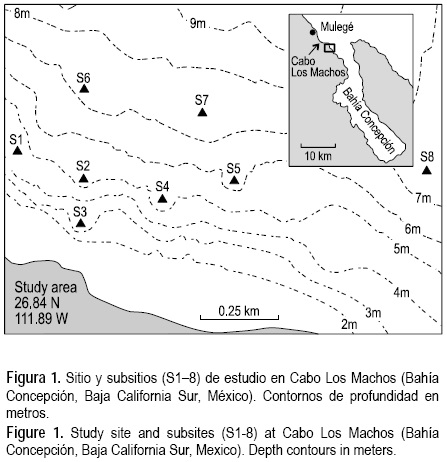 El sitio de estudio fue observado por primera vez en junio de 2000. Se realizaron observaciones cualitativas en abril de 2001, junio de 2002, marzo de 2004, octubre de 2004 y octubre de 2006, y muestreos cuantitativos del 19 al 27 de marzo de 2003 (en lo sucesivo marzo) y del 26 al 30 de octubre de 2003 (en lo sucesivo octubre), usando botes inflables y equipo de buceo autónomo (Scuba). El sitio se localiza al final de un arroyo al occidente de la boca de Bahía Concepcíon, ~0.5 km al sureste de Cabo Los Machos (fig. 1). Su fondo consiste de una mezcla de roca (cantos rodados) y arena (mezcla de fragmentos de rodolitos, arena silicoclástica y rocas pequeñas) desde la zona intermareal hasta ~8 m de profundidad, y se extiende ~0.6 km mar adentro y ~1 km a lo largo de la costa. Las especies L. muelleri y S. horridum se encuentran en todo el sitio, la primera en parches de arena gruesa entre las rocas y la segunda fijada a rocas y ocasionalmente a rodolitos grandes (como lo indican Kendrick y Brearley [1997] para Sargassum spp. en Australia occidental). A profundidades mayores que 8-9 m, más allá del borde oceánico del sustrato rocoso, se observó una rápida disminución de L. muelleri y S. horridum, y un aumento en la abundancia de los rodolitos de Lithophyllum margaritae así como de sedimento fino.