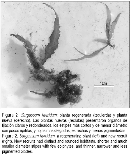 Los métodos de muestreo, los subsitios estudiados y la frecuencia del muestreo variaron según lo que se estaba estudiando y las limitaciones logísticas. En marzo se recolectaron todos los rodolitos >0.5 cm de diámetro que se encontraron en un solo cuadrante de 3.14 m2 (1 m de radio) de los ocho subsitios, y su diámetro mayor se midió al 1 mm más cercano. En ambos periodos de muestreo se contó el número de órganos de fijación de S. horridum en cinco cuadrantes de 0.25 m2 localizados aleatoriamente a lo largo de una línea de 20 m en los subsitios 1, 2, 3, 5 y 6. Se utilizó la densidad media en los cinco cuadrantes de cada sitio y para cada periodo como medida de abundancia de cada subsitio. En octubre de 2004 se anotaron las nuevas plantas (reclutas) de S. horridum que crecián sobre un marcador de concreto colocado en el subsitio 2 en octubre de 2003. Su morfología era marcadamente diferente a la de las plantas regeneradas de años anteriores (fig. 2). Para comenzar a evaluar la contribución relativa de estas dos fuentes a las densidades de adultos maduros, se contó el número de cada uno a lo largo de un solo transecto en los subsitios 1 y 2 en octubre de 2004 hasta que se habían contado ~50 individuos en total. Las plantas nuevas (reclutas) son pequeñas y con frecuencia sólo pudieron ser reconocidas después de eliminar el sedimento que las cubría y las algas filamentosas que, aunque debílmente, estaban fijas a ellas.