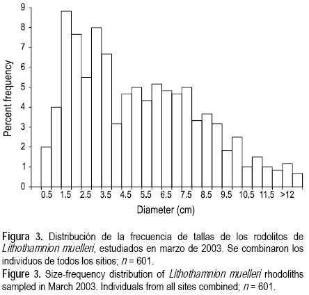 La cobertura de L. muelleri fue similar entre los dos periodos de muestreo (tabla 1), lo que junto con las observaciones cualitativas de su densidad en octubre indicó poca variación temporal en su abundancia. El muestreo de los cuadrantes en marzo mostró una densidad media de 23.9 (5.6) ind m-2, con las tallas más abundantes entre 1.5 y 4 cm de diámetro (fig. 3). El individuo más grande que se encontró tuvo 15 cm de diámetro. Los individuos mayores fueron más abundantes en aguas someras, y la regresión mostró una relación negativa significativa entre la profundidad y el diámetro medio de los rodolitos entre los ocho subsitios muestreados (fig. 4).