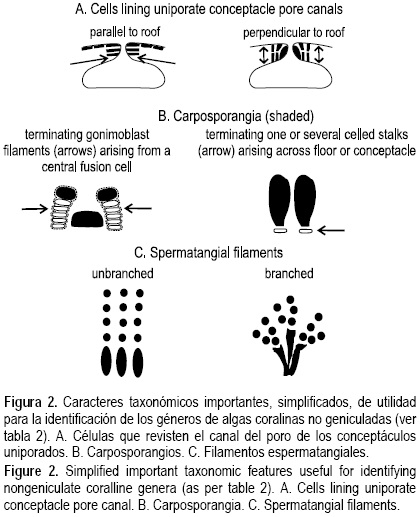 (a) La tabla 2 muestra una clave tabular de los caracteres y sus respectivos estados para los ocho géneros no geniculados que forman rodolitos. En las figuras 1 y 2 se ilustran los caracteres taxonómicos importantes (ver también Womersely 1996, Harvey et al. 2005).