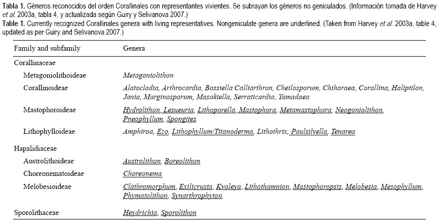 El orden Corallinales incluye tres familias con representantes de géneros vivientes (Harvey et al. 2003a). Taxonómicamente, dos familias (Sporolithaceae y Hapalidiaceae) incluyen sólo géneros no geniculados, mientras que el tercero (Corallinaceae) incluye tanto géneros no geniculados como geniculados. Este trabajo se enfoca exclusivamente en los taxones no geniculados.