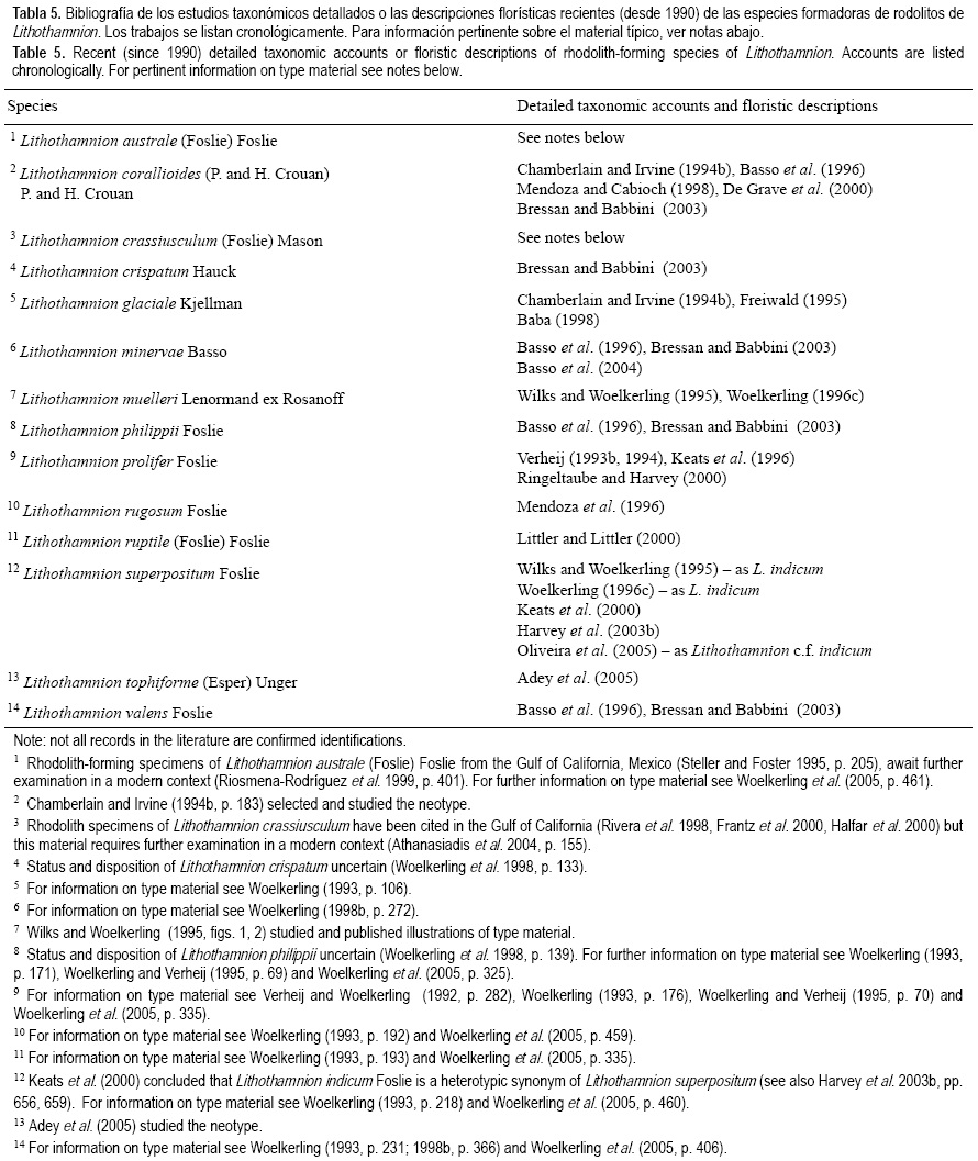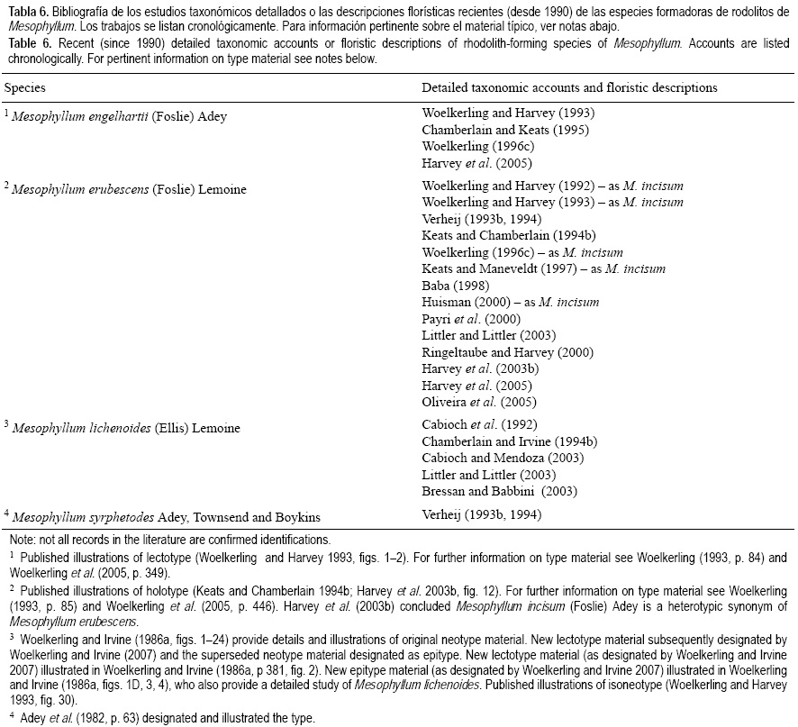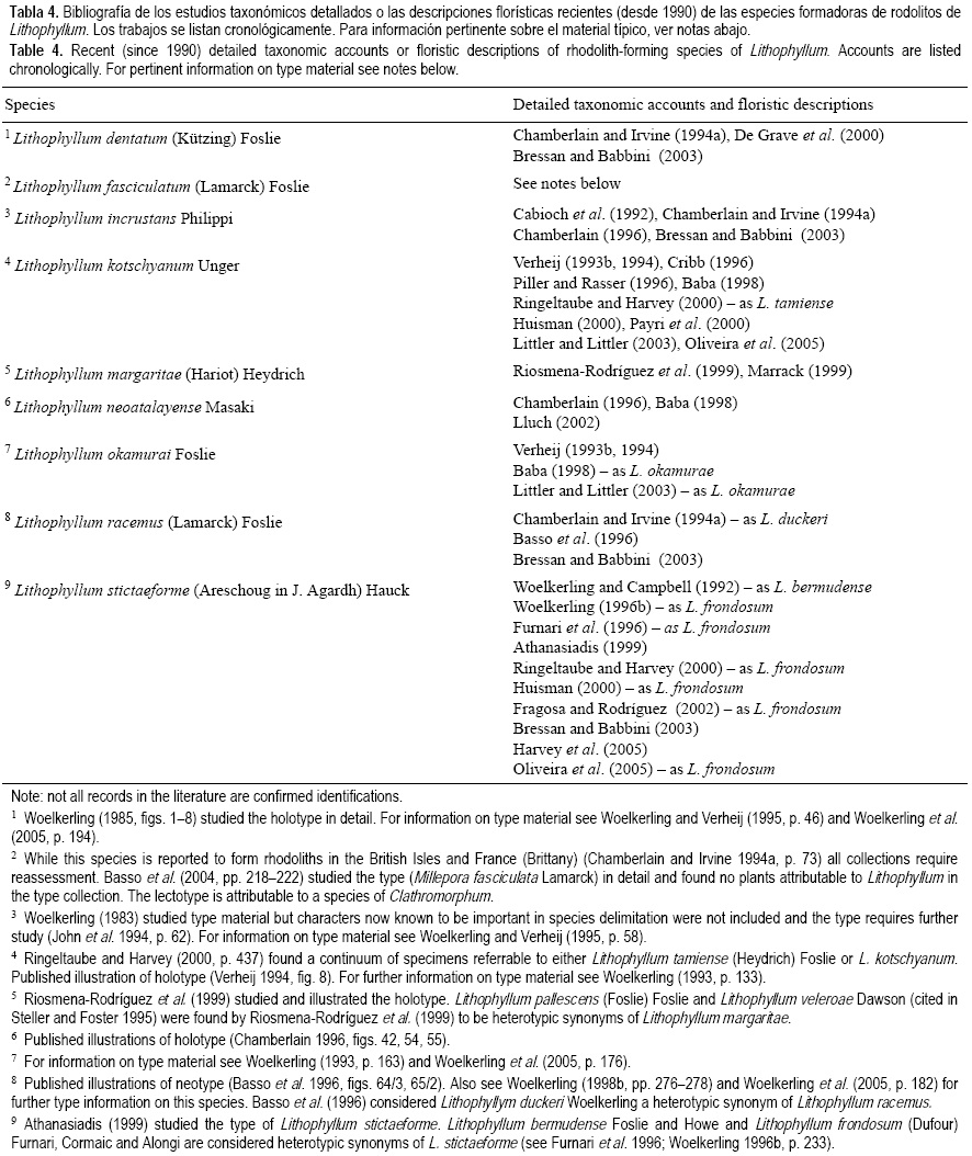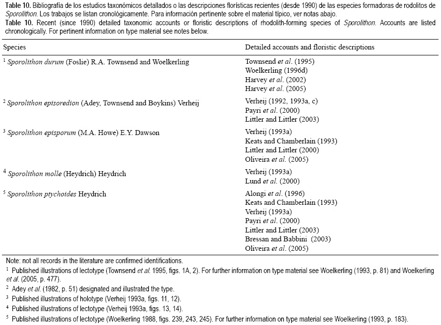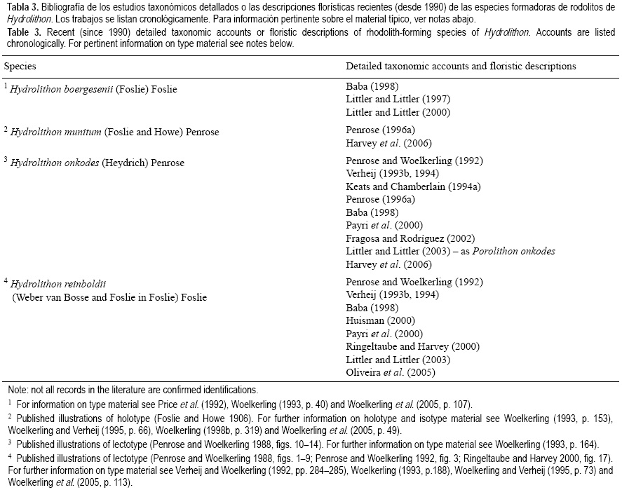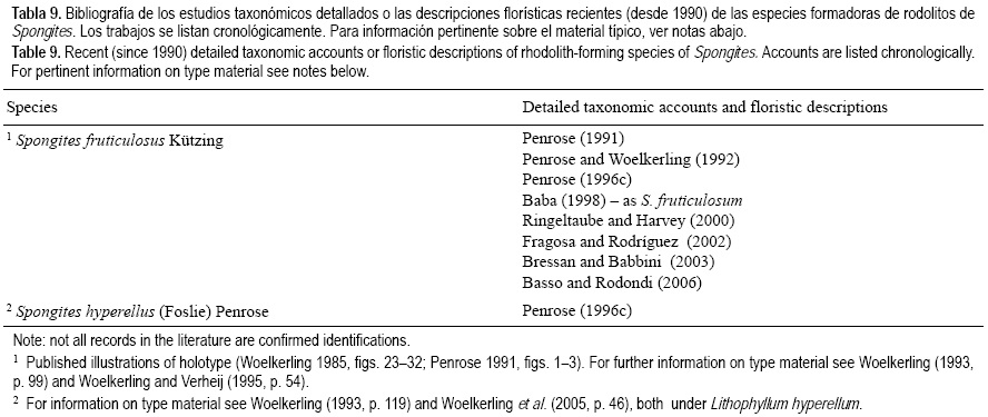 Las algas coralinas no geniculadas son muy variables en su morfología (Woelkerling et al. 1993a). Una sola especie puede mostrar una variedad de formas de crecimiento que pueden ser exhibidas por varias otras especies, lo cual dificulta una identificación visual (ver Womersley 1996, pp. 196, 206, 230). Mientras que las guías de campo o los listados florísticos tienden a ser más a menos para el usuario que las revisiones taxonómicas, la identificación se puede basar más bien en las características vegetativas y/o morfológicas más evidentes que en los caracteres reproductivos de importancia taxonómica. No obstante, las descripciones florísticas a menudo incluyen fotografías útiles e información importante, y con frecuencia resultan ser un buen punto de partida para la identificación de los especímenes. En las tablas sólo se incluyen las publicaciones que contienen descripciones ilustradas o estudios detallados de los taxones. No se presentan registros no confirmados de otras especies formadoras de rodolitos que aún tienen que ser analizados desde el punto de vista taxonómico.