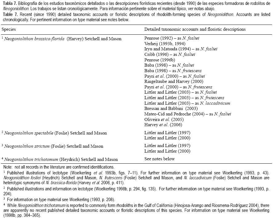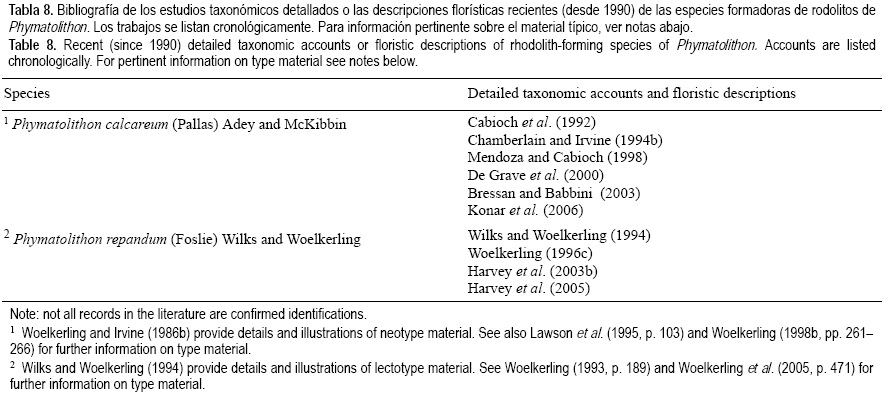 Se han descrito más de 1600 especies no geniculadas y taxones infraespecíficos (Woelkerling 1988, 1998a), pero un legado de trabajo taxonómico de mala calidad, particularmente entre 1890 y 1910, ha dejado muchos problemas sin resolver y el número real de especies aún queda por determinarse (Woelkerling 1998a). No existe ninguna monografía mundial del orden Corallinales, y la evaluación de los caracteres empleados en la delimitación de especies a nivel mundial es actualmente materia de investigación. Muchos especímenes típicos de especies formadoras de rodolitos requieren de un análisis moderno y, hasta que esto suceda, no hay ninguna certeza de que los nombres publicados han sido aplicados de forma correcta. En consecuencia, los nombres de especies que se manejan en la literatura deben ser usados con cautela. Por tal motivo en las tablas 3-10 (4, 5, 6, 7, 8, 9) también se incluye información pertinente de material típico para cada especie.
