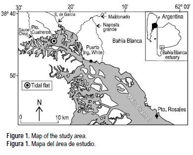 El estuario de Bahía Blanca (38°42'-39°25' S, 61°50'-62°22' W) (fig. 1), situado en el sudoeste de la provincia de Buenos Aires, es el estuario más grande de Argentina después del estuario del Río de la Plata. Se ha clasificado como un estuario de planicie costera mesomareal y comprende un área de 2300 km2, 50% de la cual corresponde a planicies de marea. La principal entrada de energía mecánica al sistema es generada por una onda de marea semidiurna (Perillo et al. 2000). El rango de marea medio se incrementa desde la boca (2.2 m) hacia la cabecera (3.5 m; Perillo y Píccolo 1991). Los rangos mareales medios en sicigias y cuadraturas son 2.7 y 1.8 m en la boca y 4 y 3 m en la cabecera, respectivamente (Perillo et al. 2004). Intensas corrientes de marea (que alcanzan los 0.6-0.8 m s-1 en los canales más profundos cercanos a Puerto Rosales, Perillo et al. 2004) y vientos determinan la circulación estuarial y generan la mezcla vertical, causando gran turbidez. Los principales tributarios que aportan agua dulce al sistema son el Río Sauce Chico y el Arroyo Napostá Grande. Los vientos son persistentes a lo largo del año, con una velocidad media anual de 6.25 m s-1. El número de días en un año en que éstos presentan velocidades mayores a 43 km h-1 puede ser hasta de 196 días (Capelli de Steffens y Campo de Ferreras 2004). Las planicies de marea del estuario de Bahía Blanca son superficies de escasa pendiente, principalmente compuestas por sedimento limo-arcilloso. Debido a la predominancia de la fracción fina, el agua es retenida en los intersticios y los sedimentos se hallan generalmente en un estado de saturación o cercano a la saturación (Beigt et al. 2003). Investigaciones previas han demostrado que durante los meses invernales el contenido de agua en el sedimento de las planicies de marea es de aproximadamente 40% en bajamar (Cuadrado, com. pers.). Durante el verano se suelen observar valores altos de salinidad en la cabecera del estuario. El valor más alto que se ha registrado es de 52 (Freije et al. 1981). La principal causa de la hipersalinidad en el interior del estuario es probablemente la existencia de valores altos de evaporación (Freije et al. 1981).