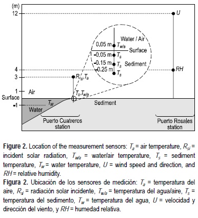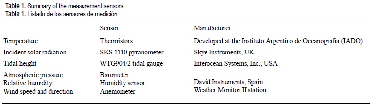 Las condiciones meteorológicas y oceanográficas se monitorearon en el estuario de Bahía Blanca de enero a diciembre de 2003. La tabla 1 muestra una lista de los sensores utilizados. La temperatura se midió cada 10 min mediante una cadena de termistores instalada en el área de estudio (fig. 2). Los termistores se localizaron debajo de la superficie del sedimento (a 0.05, 0.15 y 0.25 m de profundidad), en la columna de agua (1 m de profundidad en bajamar) y en la columna de aire (a 3 m de altura). Otro termistor, ubicado a 0.05 m de altura, registró la temperatura del agua o del aire dependiendo del estado de marea. La radiación solar se registró cada 10 min mediante un piranómetro SKS 1110 y la altura de marea se obtuvo con un mareógrafo WTG904/2. Ambos equipos fueron instalados en la planicie mareal de Puerto Cuatreros.