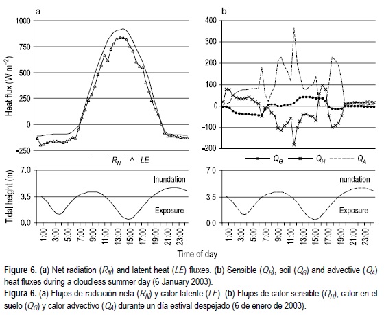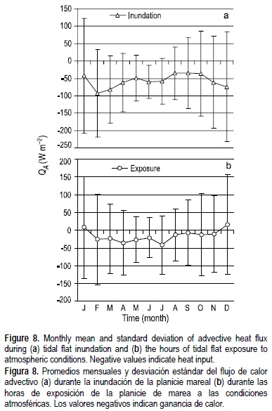 El flujo de calor latente fue positivo (dirección ascendente) durante todo el año. La tasa máxima de evaporación se produjo en diciembre (12 mm d-1) y la evaporación anual alcanzó 2127 mm (tabla 3). Los flujos advectivos debidos a los vientos (exposición) fueron siempre de menor magnitud que los causados por mareas (inundación) (fig. 8). Ambos mostraron valores medios negativos (adición de calor a la planicie mareal) durante el período de estudio, excepto en enero y diciembre (los meses más cálidos) cuando los vientos actuaron sustrayendo calor de la planicie de marea.