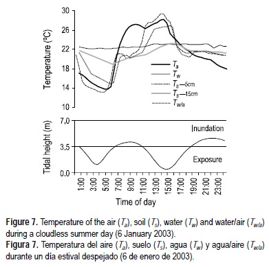 Para estudiar las fluctuaciones de los flujos de calor debidas a la marea, se analizaron diferentes ciclos diarios. Los intercambios calóricos ocurridos durante un día despejado de verano (6 de enero de 2003) se muestran como ejemplo (fig. 6). Las temperaturas registradas en el aire, suelo y agua durante ese día se muestran en la figura 7. Durante las primeras horas del día (00:00-06:30), el suelo (calentado por una inundación previa) se hallaba más cálido que el aire por encima de él, permitiendo una circulación ascendente de QH y QG (figs. 6, 7). La inundación mareal de la mañana (06:40-11:10) detuvo el rápido calentamiento del sedimento por radiación solar, manteniendo su temperatura a ~20.5°C. El flujo de calor en el suelo (QG) se redujo bruscamente durante las horas de inundación. El aire transfirió calor al agua (QH negativo) durante este período. El flujo de calor sensible del aire hacia el suelo alcanzó su máximo (-183 W m-2) cuando la marea se retiró de la planicie y el sedimento estaba 4.1°C más frío que el aire (fig. 7). Durante la bajamar el suelo fue calentado por efecto de la radiación solar, desarrollándose un flujo ascendente de QH. En tanto, QG fue positivo (dirección descendente) alcanzando un valor de 42 W m-2 a las 13:40, cuando la radiación solar y la temperatura del aire fueron máximas. Previamente a la siguiente inundación (17-18 h, fig. 6), el aire estaba 1.7°C más cálido que el sedimento, de manera que QH fue nuevamente negativo (↓). Al mismo tiempo los vientos sustrajeron calor de la planicie mareal (QA positivo). La segunda inundación mareal evitó la pérdida de calor del suelo que hubiese ocurrido por flujos turbulentos si el sedimento hubiese estado en contacto directo con el aire. QG fue nuevamente reducido por la marea, produciéndose a su vez una transferencia calórica desde el agua hacia el aire (QH positivo). El flujo de calor latente mostró un patrón típico, siguiendo el comportamiento de la radiación neta. La condensación fue escasa y ocurrió durante las horas nocturnas (20:00-06:30), en condiciones de alta humedad relativa y bajas temperaturas del aire. La disminución en la velocidad del viento durante la noche también contribuyó al proceso de condensación. El flujo de calor latente no fue determinado de forma directa por los estados de marea debido a que la saturación continua del sedimento de la planicie permitió una disponibilidad permanente de agua para evaporar. El flujo de calor advectivo (residual) (QA) mostró valores positivos o nulos a lo largo del día estival, indicando una sustracción casi contínua de energía calórica de la planicie mareal. Los picos se observaron cuando la marea se retiraba de la planicie (11 h, QA= 367 W m-2) o comenzaba a cubrirla (17 h, QA = 228 W m-2; 6 h, QA = 180 W m-2 ), indicando la importancia de las corrientes mareales y de los vientos en la distribución del calor.