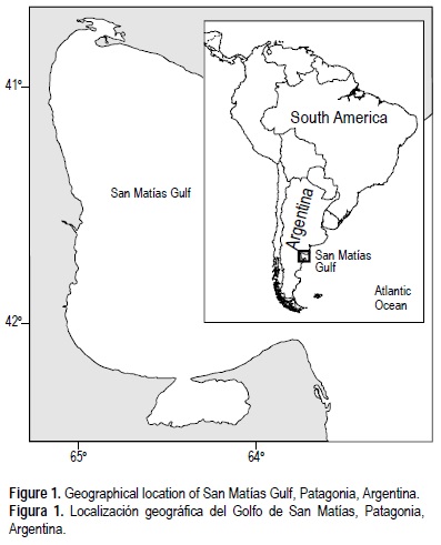 Se capturaron especímenes de S. guggenheim entre enero y diciembre de 1996 mediante una red de arrastre de fondo en el Golfo de San Matías (fig. 1). Se realizaron lances comerciales de 3 h, y de investigación de 30 min, a profundidades de 20 a 130 m, utilizando una red de arrastre comercial de 29 m con puertas rectángulares.