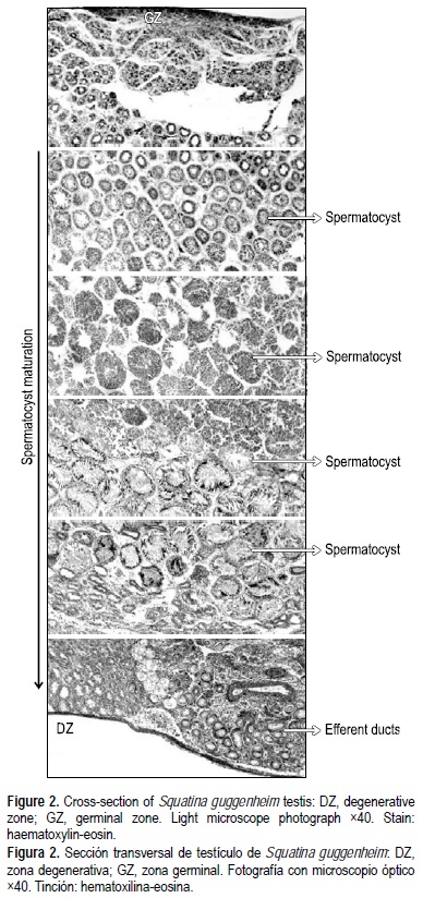 La observación al microscopio de los testículos de S. guggenheim mostró desarrollo de los espermatocistos desde la zona germinal hasta la pared opuesta del testículo, donde se localizan los conductos deferentes. De acuerdo con la clasificación de Pratt (1988) sobre el origen, desarrollo y propagación de los espermatocistos, este patrón de madurez corresponde al tipo diametral. Se ha descrito un patrón similar en la maduración de espermatocistos de S. dumeril (Pratt 1988). En el sistema reproductor de las hembras de S. guggenheim se observaron ambos úteros pero sólo un ovario funcional, el izquierdo. Tal asimetría ovárica y simetría uterina funcional ha sido observada en otras especies de tiburones ángeles, como S. californica (Natanson y Cailliet 1986) y S. occulta (Sunye y Vooren 1997). En contraste, se han descrito úteros y ovarios simétricamente funcionales en S. oculata (Capapé et al. 1990, 2002), S. tergocellata (Bridge et al. 1998), S. squatina (Capapé et al. 1990) y S. aculeata (Capapé et al. 2005).