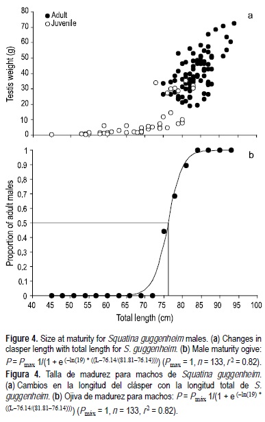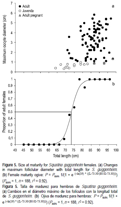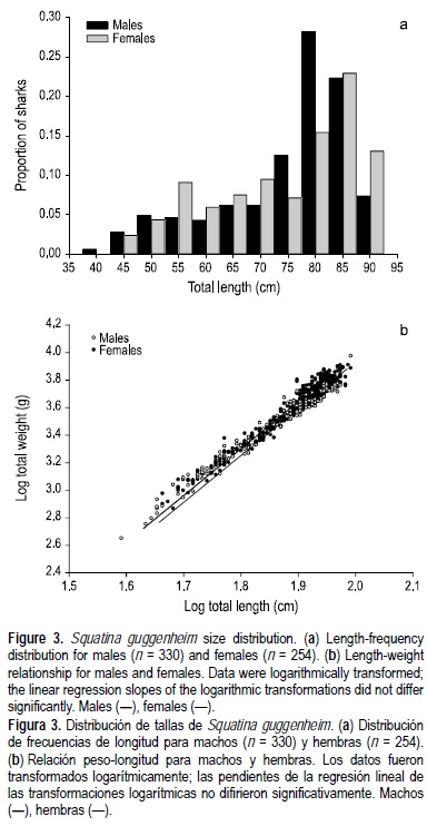 No se observó dimorfismo sexual en cuanto a la talla de S. guggenheim. Ambos sexos alcanzaron LTs similares y mostraron relaciones peso-longitud similares. En contraste, se ha informado sobre tal dimorfismo sexual en otros escuatínidos, como S. tergocellata (Bridge et al. 1998), S. squatina y S. oculata (Capapé et al. 1990, 2002), con las hembras alcanzando mayores tallas que los machos. Asimismo, Bridge et al. (1998) encontraron que las diferencias en las tallas de S. tergocellata comienzan al inicio de la madurez sexual cuando las hembras empiezan a crecer más que los machos. Es interesante mencionar que ambos ovarios son funcionales en las especies de Squatina que muestran dimorfismo sexual. Este hecho sugiere que las tallas mayores de las hembras pueden estar asociadas con una cavidad corporal más grande para poder acomodar grandes cantidades de material reproductivo.