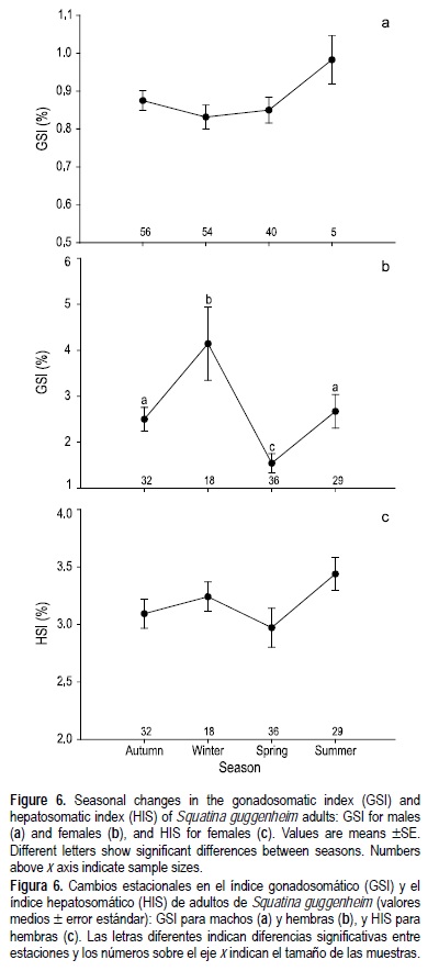 En las hembras adultas los niveles del índice gonadosomático fueron similares durante verano y otoño, aumentando significativamente en invierno para luego disminuir en primavera (F = 6.10; g.l.3,134; P < 0.05) (fig. 6b). En contraste, la relación entre el índice hepatosomático y la temporada no mostró ningún cambio estacional evidente (F = 2.85; g.l.3,134; P > 0.05) (fig. 6c).