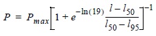 donde Pmax es la proporción máxima (%) de animales en estado adulto, l50 es la longitud a la que 50% de la proporción máxima de animales se encuentra en estado adulto, y l95 es la longitud a la que 95% de la proporción máxima de animales se considera en estado adulto. Los parámetros de la ecuación fueron estimados con la función Solver del paquete estadístico Excel (Microsoft® Excel 2000).