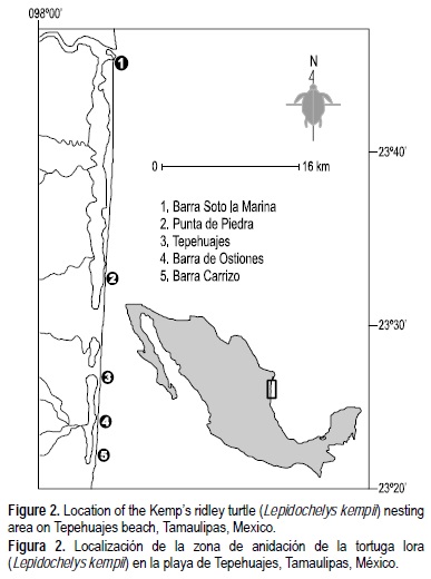 La playa de Tepehuajes (Tamaulipas, México) se localiza en el Golfo de México (23°30'1" N, 97°46'8" W; fig. 2), cerca de la zona de reserva natural Rancho Nuevo, y contiene una zona de anidación de tortuga lora de 47 km. Limita al sur con Barra Carrizo y al norte con Barra Soto la Marina. Esta playa se encuentra protegida por dunas de arena fina con una altura media de 2.5 m (Márquez 1994).