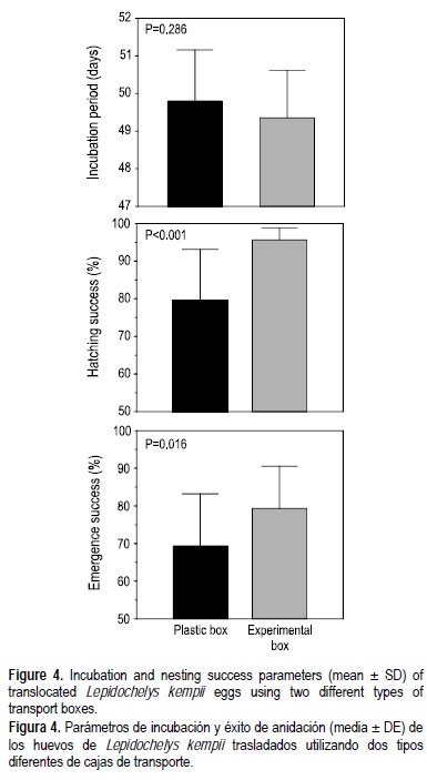 El tiempo que transcurre durante el traslado de los huevos es importante y se recomienda que éste se realize en un periodo de 1-6 h (Boulon 1999), preferentemente antes de 2 h después de la puesta (Mortimer 1999). La recolección y el transporte de los huevos en este estudio se realizó en 50 ± 31 min, dentro del intervalo de tiempo recomendado. Además, no se observaron efectos significativos sobre el tiempo de incubación de los nidos trasladados con los dos sistemas de transporte. Esto sugiere que las condiciones de transporte (temperatura, humedad, tiempo) resultaron similares para ambos sistemas, así como en el sitio de eclosión.
